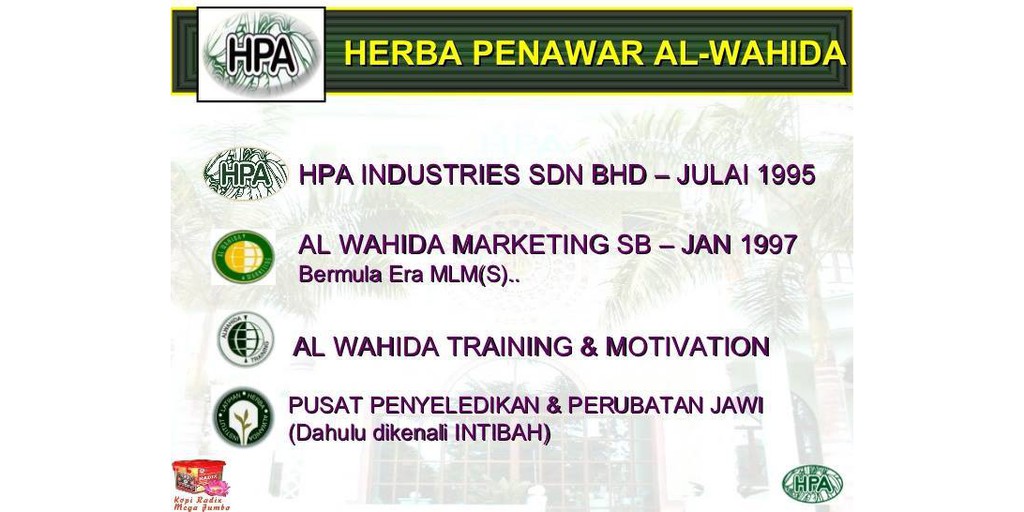 Bhd diasaskan oleh seorang anak tani yang berpengalaman luas dalam bidang herba di malaysia. Keistimewaan menjadi ahli hpa (mlm syariah) yuran keahlian(kit niaga) rm30.00 (tiga puluh ringgit malaysia sahaja) seumur hidup. The group's principal activities are in the manufacturing and marketing of traditional herbs as alternative treatments as well as health products. 7 & 8, kawasan miel jejawi fasa 2, Hpa began its humble beginning in perlis in february 1996 as a cottage industry called al wahida traditional medicines.
