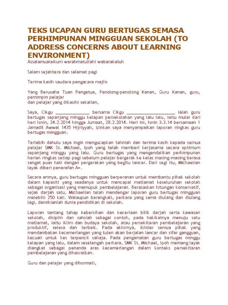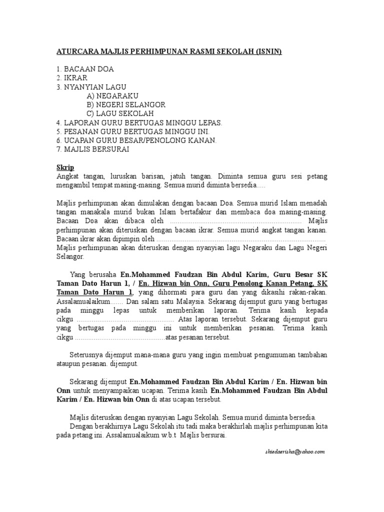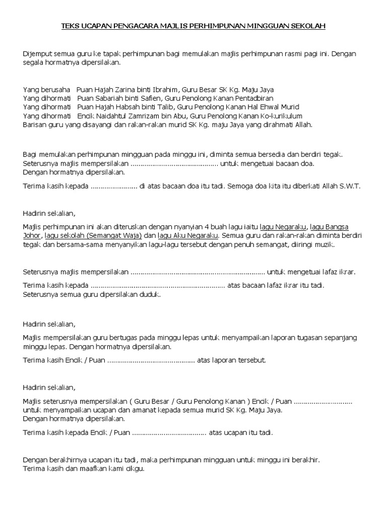 Sekolah menengah kebangsaan sri nipah bachok,kelantan16300malaysia+ google map. Amsy koleksi bahan motivasi dan ebook terbaik via www.amsy.biz. Teks pengacara majlis perhimpunan rasmi mingguan rasmi. Puan rosmizawati binti yusub 4. Ya allah ya munzilal barakat berkatilah usaha usaha kami mudah mudahan dengan usaha usaha kami sekolah ini akan menjadi sekolah yang cemerlang.